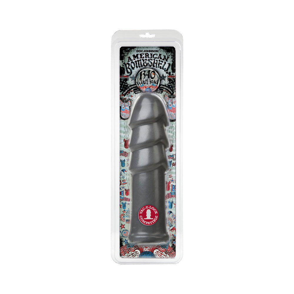 The B-10 Warhead is the next generation of tactical bedroom toys! This 10 in. behemoth (9.7 in. insertable) features a triple rippled head for extraordinary stimulation. The long and thick shaft reaches a circumference of 8.5 in. at its fullest. This Warhead takes no prisoners and leaves no body unfilled. Made of PVC, with gunmetal color.