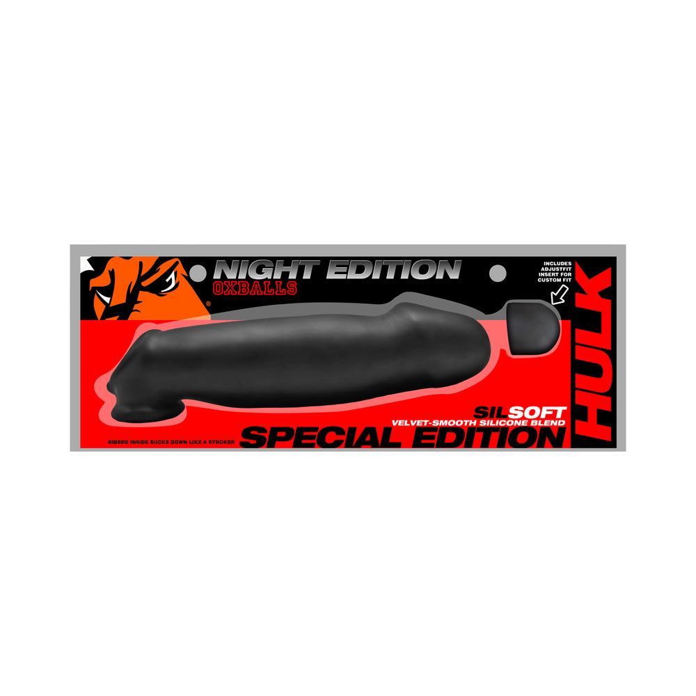 HULK gargantuan hole-stretching cocksheathHULK monster-huge NIGHT EDITION cocksheath… in new softer rubbery silicone blend SPECIAL EDITION new from OXBALLS The Largest, thickest, longest cocksheath This version is softer and blubbery for a squishier fuck Extra-rubbery feel and inner JO ripples ADJUSTFit insert included for custom shaft fit Velvet-smooth deep black color NIGHT EDITION special softer silicone blend OXBALLS softer squishy version HULK cocksheath NIGHT EDITION in our lush rubbery SILSOFT blend and a smooth, velvet-black color. This is a softer, squishier formula for the hardest and darkest of play.HULK is our biggest cocksheath, designed only for the most intense experienced holes–it”s been one of our best cocksheaths, but we got many requests for a squishier, blubbery, hole-packing version in a more premium softer silicone mix. We made it in our NIGHT EDITION silicone blend rubber–the perfect stuff for a more fleshy feel.HULK is a massive-thick, heavy, meaty slab of dicksheath designed for filling the really hulky gaping holes…this velvet-smooth cocksheath wraps around your meat adding 3-5 X more girth and 5-7 inches more length…it”s really fuckin” big. It”s the biggest fattest longest cocksheath we make…or anyone makes.HULK stays on your hard or soft dick with our grippy COCKSLING design base…but as you stroke and pump it strokes your meat, (our cocksheaths make amazing JO strokers), the inner ridges and nubs jack you while you tug it, or fuck a hole with it… HERE”s HOW: lube your junk just a bit, slide in squeezing the shaft hole air out so it sucks you in…once all the way in, stretch the ball hole and drop your bag through.Comes with our ADJUSTFit soft insert so you can custom fit to your shaft size…get additional ADJUSTfit inserts in three-packs for even more custom fit–we design our cocksheaths to fit any size shaft.MATERIAL AND CARE:NIGHT EDITION”s plush silicone-blend rubber is Phthalate free with no scent and has amazing super-strong stretch. SILSOFT is LUBE SAFE, we recommend water-based lube like our premium thick OXLUBE, hybrid easy-cleanup OXLUBE or our super-concentrated silicone OXLUBE. Oil-based lubes not recommended.CARE: Wash all toys after use in warm soapy water, air dry, (they will last longer). Store toys separately: we recommend storing in breathable cloth pouches, or for larger toys store in clean cotton socks.Important: Cocksheaths stretch to fit around your shaft. The width and length will get larger the bigger your shaft is.PRODUCT:Length: 11″/28 cmWidth: 2.5″/6 cmDepth: 2.5″/8 cmUsable Length: 9.5″/24 cmUsable Circumference: 7.5″-9″/19-23 cmShaft hole diameter: 1.5″/4 cmBall hole diameter: 1″/3 cmInner shaft length: 6.5″/7 cmProduct weight: 19 ozPACKAGING DIMENSIONS:Length: 13″/33 cmWidth: 4.5″/12 cmDepth: 3″/8 cmPackage weight: 21 ozAll original designs copyright OXBALLS USA Designed in Los Angeles, California, MADE IN CHINA