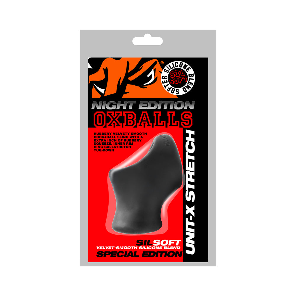 UNIT-X STRETCH slim sporty cocksling with extended ballstretchUNIT-X STRETCH ballstretching-cocksling NIGHT EDITION…velvet-smooth silicone blend SPECIAL EDITION new from OXBALLS Sleek cocksling design with added 1″+ ballstretcher Ergo-fit shape fits small to large cock and balls Super-stretchy Velvet-smooth deep black color NIGHT EDITION special softer silicone blend OXBALLS new UNIT-X STRETCH ballstretch-sling NIGHT EDITION is our cocksling with big ball-pushdown in our lush rubbery SILSOFT SILICONE blend and a smooth, velvet-black color. This is a softer, squishier formula for the hardest and darkest of play.UNIT-X STRETCH adds about 1.25″ of ballstretching connected to our ergo-fit sleek cocksling design–the extended nut-pusher extends your sack down and away from your dick, with “keep-”em-down” raised rings inside the ballstretcher part that keeps your sack tugged all the way down.The ergonomic shape and super-soft material grip your junk and meld to you like a rubbery second skin. UNIT-X STRETCH is a smooth discrete bulge-enhancer for a fully packed-out package.OXBALLS invented the original COCKSLING…UNIT-X STRETCH fits the same but slimmer…plus the added ballstretching is such a bonus.MATERIAL AND CARE:NIGHT EDITION”s plush silicone-blend rubber is Phthalate free with no scent and has amazing super-strong stretch. SILSOFT is LUBE SAFE, we recommend water-based lube like our premium thick OXLUBE, hybrid easy-cleanup OXLUBE or our super-concentrated silicone OXLUBE. Oil-based lubes not recommended.CARE: Wash all toys after use in warm soapy water, air dry, (they will last longer). Store toys separately: we recommend storing in breathable cloth pouches, or for larger toys store in clean cotton socks.Designed in Los Angeles, California, MADE IN CHINAWidth: 1.75″Height: 3″Main hole circumference: 4″Shaft hole circumference: 3.25″Ball hole circumference: 3″Weight: 2 ozAll original designs copyright OXBALLS USA