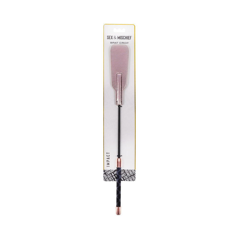 Take command and show your brat whoft.s in charge with the Brat Crop! Ramp up your play with subtle taps, playing with sensations across their body with the split tipped rose gold vegan leather before inflicting an intense smack with a satisfying snap. Perfectly crafted to extend your reach for sensual impact play in a stylish and captivating display of dominance. Stunning rose gold finishes 6.5in. split vegan leather tip 18.5in. shaft with rubberized handle for easy grip Materials: 60% PVC, 20% Glass fiber, 10% Zinc alloy, 10% PolyesterPackaging type: Hang CardPackaging: 17.25in. H x 3.5in. W x 0.57in. D