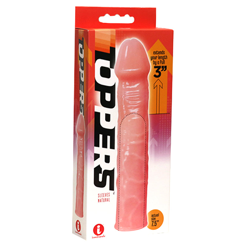 Add a full 3 inches to the length of your penis by sliding into Toppers, new from Icon. A stretchy, body safe TPR sleeve fits snugly around your shaft, and at the end is a solid, ultra-real extension, firm, squeezable, just like the real thing. Penetrate your lover with its realistic head shaft–much better then a dildo–you can control the action! For a custom fit, the bottom can be trimmed. Add a full 3 inches to the length of your penis by sliding into Toppers, new from Icon. A stretchy, body safe TPR sleeve fits snugly around your shaft, and at the end is a solid, ultra-real extension, firm, squeezable, just like the real thing. Penetrate your lover with its realistic head shaft–much better then a dildo–you can control the action! For a custom fit, the bottom can be trimmed.